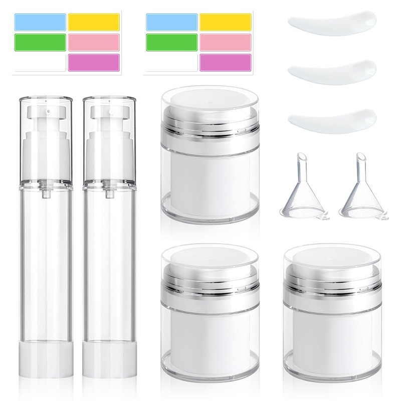 • 【Valuable kit】You will receive 12 pieces airless pump jar set, included 3 cream jars, 1 spray bottle, 1 pump bottle, 3 cosmetic spatulas, 2 mini funnels and 2 sheet label stickers. These airless jar in 1.7oz/50ml are perfect dispensers for your favorite face cream, lotion and cosmetics. Come with spatulas and funnels, you can easily transfer your skin care products to the airless containers. Valuable set with sufficient quantity that you can share with families or friends.
