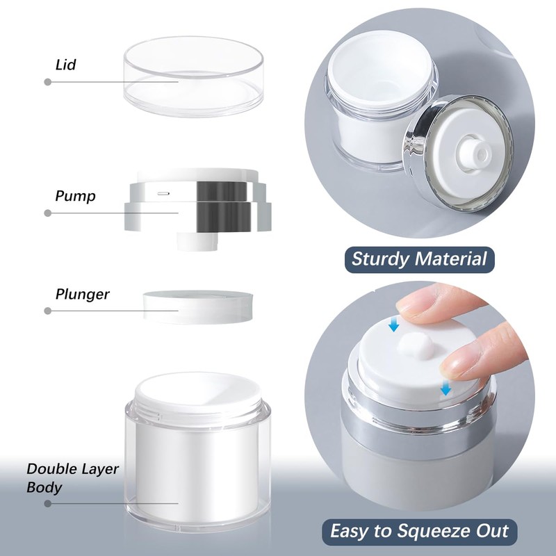 Airless pump jar set with innovative vacuum design are practical and convenient for you to use, will be good helper to your skincare routine, make up and travel.