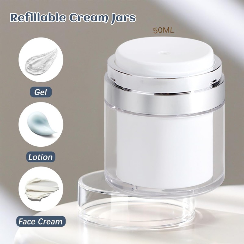 • 【Airless Pump container】Refillable cream jars adopt vacuum design that can reduces the contact between face cream and air, help to maintain the pureness of inner content and prolong their shelf life. Refillable containers with innovative vacuum design are easy to squeeze out cream, that are mess-free and much more hygienic than repeatedly dipping your fingers into a whole jar of skincare.