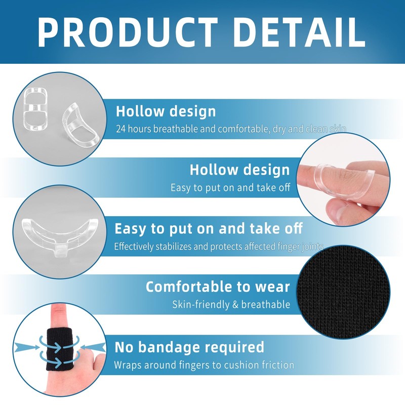 Finger splints provide strong support for your fingers, while finger sleeves provide supplementary support. Together, they can effectively solve a variety of finger problems - help recover from finger injuries, straighten bent fingers, provide support for hammer fingers, protect trigger fingers, etc.; and limit excessive finger movement.