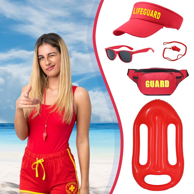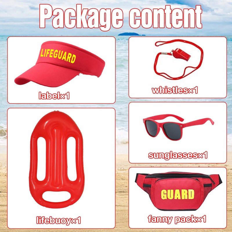- đăLifeguard AccessoriesăYou will receive 1 lifeguard hat, 1 lifeguard prop, 1 whistle with strap, 1 pair of sunglasses and 1 red adjustable fanny pack. You can quickly complete your party costume with this simple lifeguard costume.