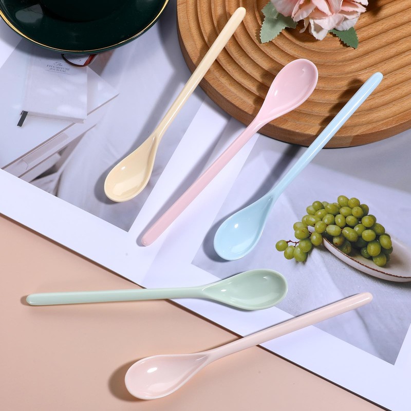 - "【Package includes】This package includes 5 melamine coffee stirring spoon in vibrant, refreshing colors—cherry pink, orange pink, bean paste green, baby blue, and goose yellow—adding a stylish touch to your kitchen or party decor. The colors are long-lasting and won’t fade or peel easily.