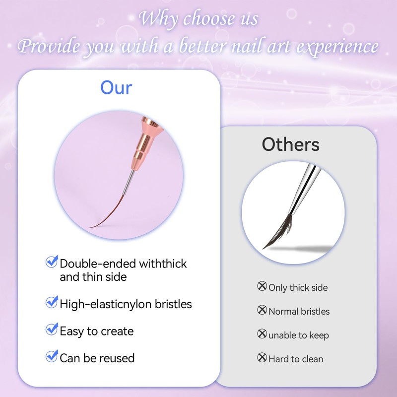 - VERSATILE USE: Essential for DIY manicures, these nail liner brushes are perfect for creating hook edges, pulling fine lines, delicate patterns, flowers, and plaids. Ideal for detailed work, filling in colors, smudging, and blending, they make nail art easy and enjoyable