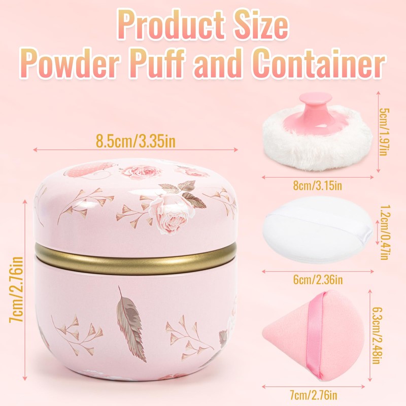 - COMPACT & PORTABLE: This dusting powder container inner height 7 cm / 2.76 in, outer diameter 8.5 cm / 3.35 in, and capacity 30-50 grams. The diameter of the powder puff with handle is 8 cm / 3.15 in, and the height is 5 cm / 1.97 in. The small powder puffs have a diameter of 6 cm / 2.36 in and a height of 1.2 cm / 0.47 in. Size of 3 triangle powder puff is 6.3*7cm/2.48*2.76in. Perfect for home or travel use