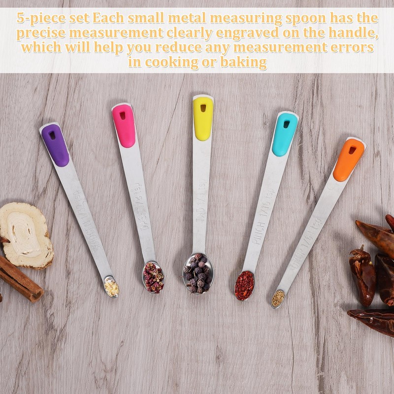 - 【Compact and Versatile】 This set includes 5 mini measuring spoons with capacities of 1/64 tsp, 1/32 tsp, 1/16 tsp, 1/8 tsp, and 1/4 tsp. The compact design ensures they fit easily into spice jars and kitchen drawers