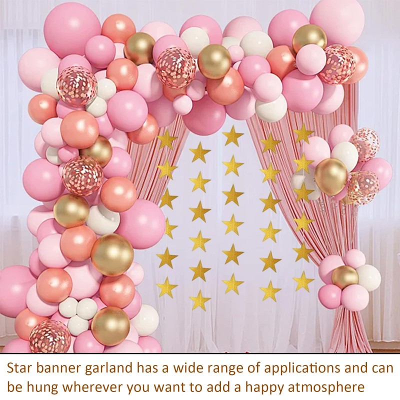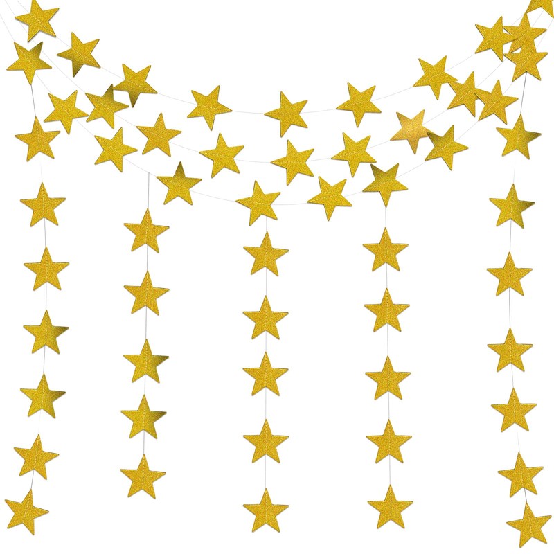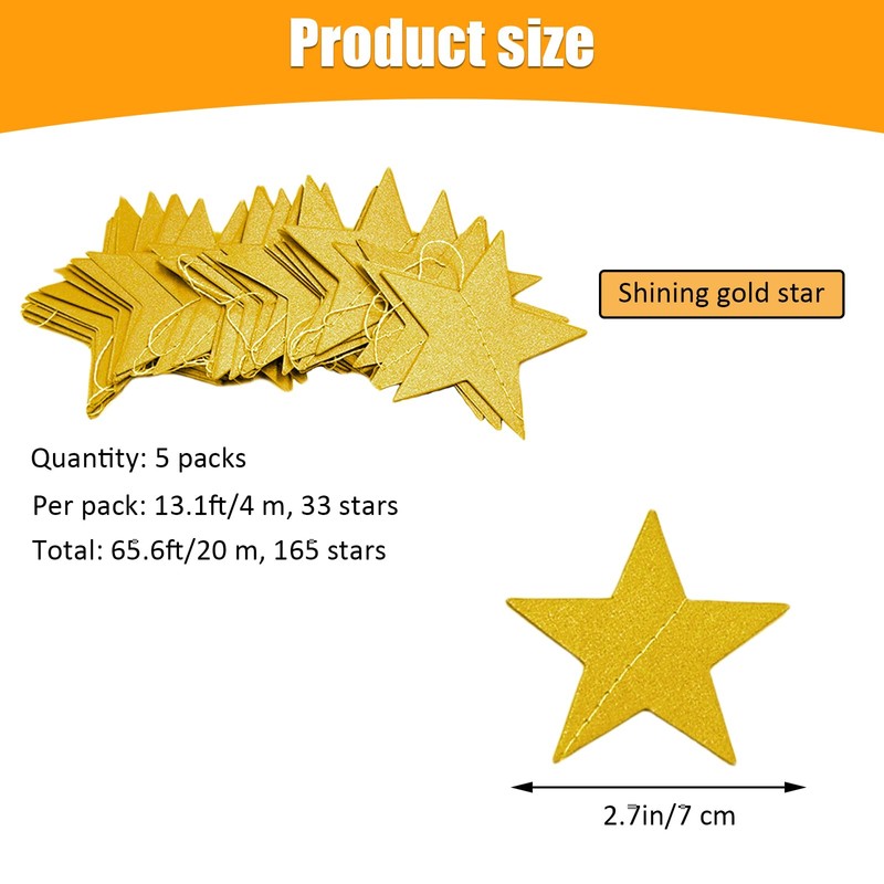 - 【Size】5 packs of gold star glitter,each star measuring 2.75 inches/7cm, each pack 13 feet/4 meters long, total 65 feet/20m. Each banner has 33 little stars. Sufficient quantity to meet your party decoration needs.