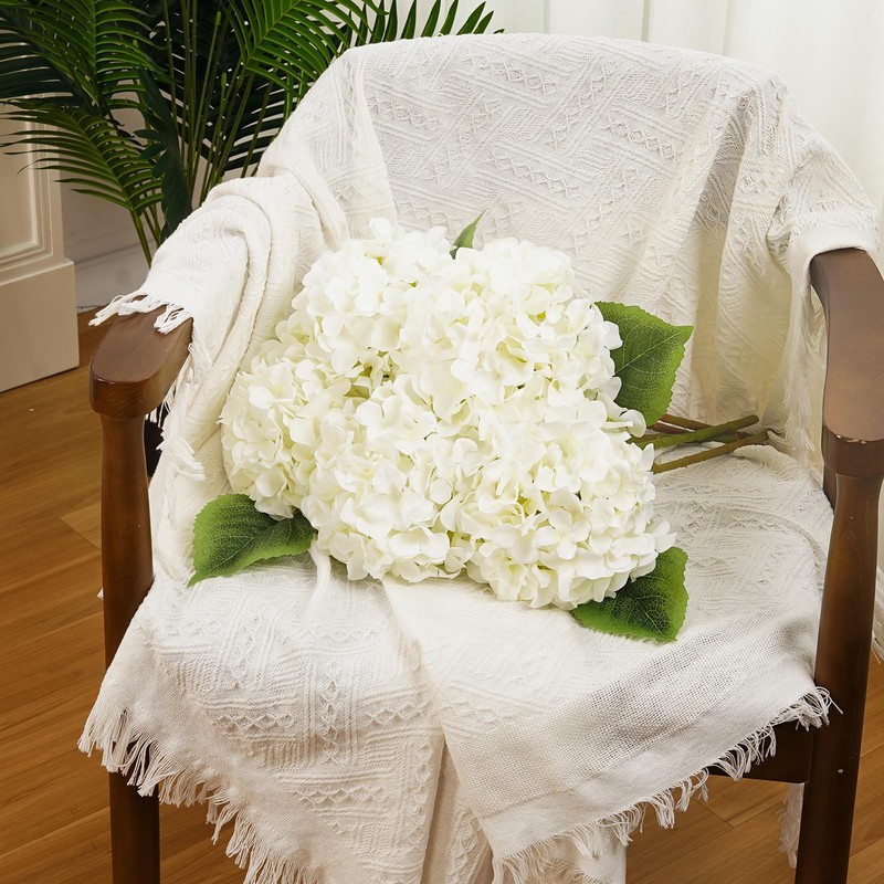 - PACKAGE INCLUDES: You'll receive 5 bundles of these beautiful artificial hydrangeas. Each artificial hydrangea measures 20 inches, with each large flower head at 7.1 inches. Each flower comes with 2 leaves and a bendable stem (vase not included) for easy bending to fit your vase. For shipping convenience, flower heads and stems are separated in the same box. Shake flower heads before assembling stems to make blooms plump and naturally spread.
