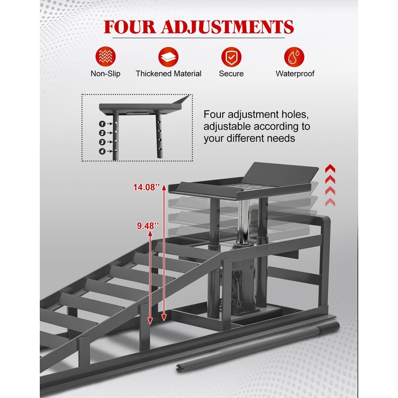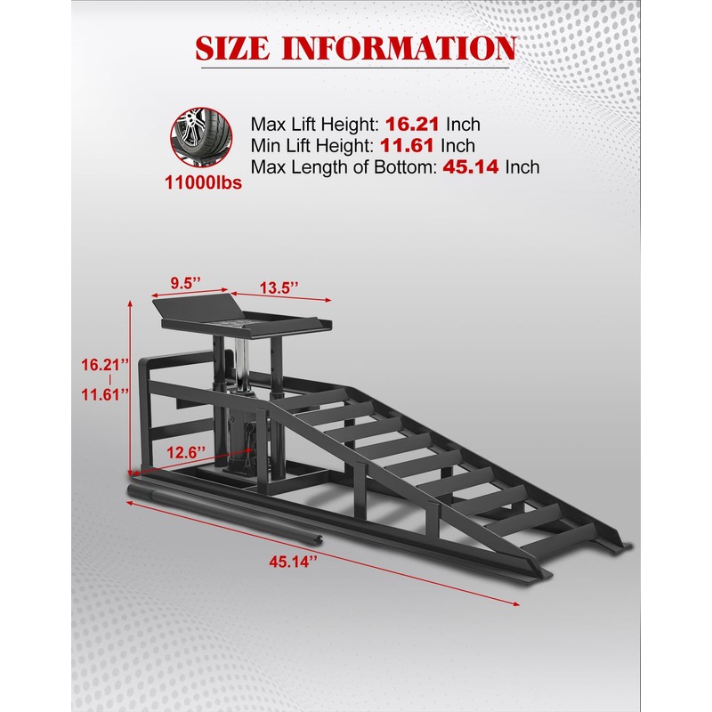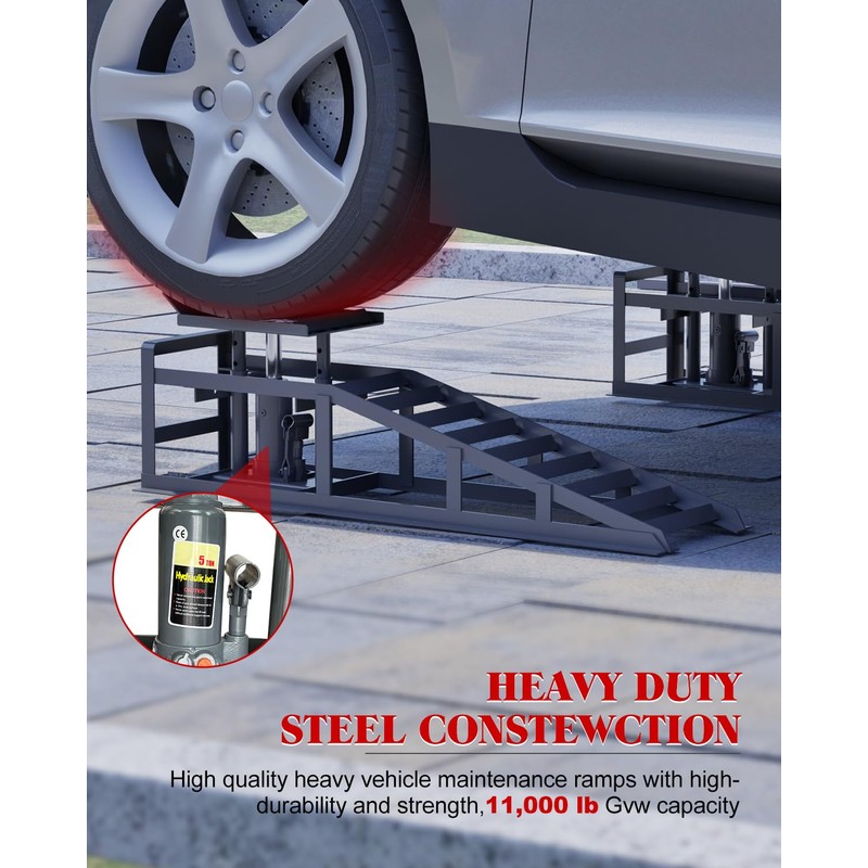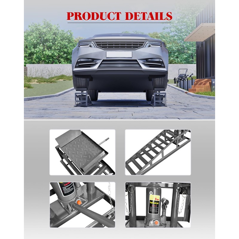 - Hydraulic Lift + Jack Combo: Includes two 5T hydraulic ramps + a hydraulic jack for effortless lifting/lowering. Adjust heights precisely (up to 16.21") for oil changes, tire rotations, or undercarriage work.