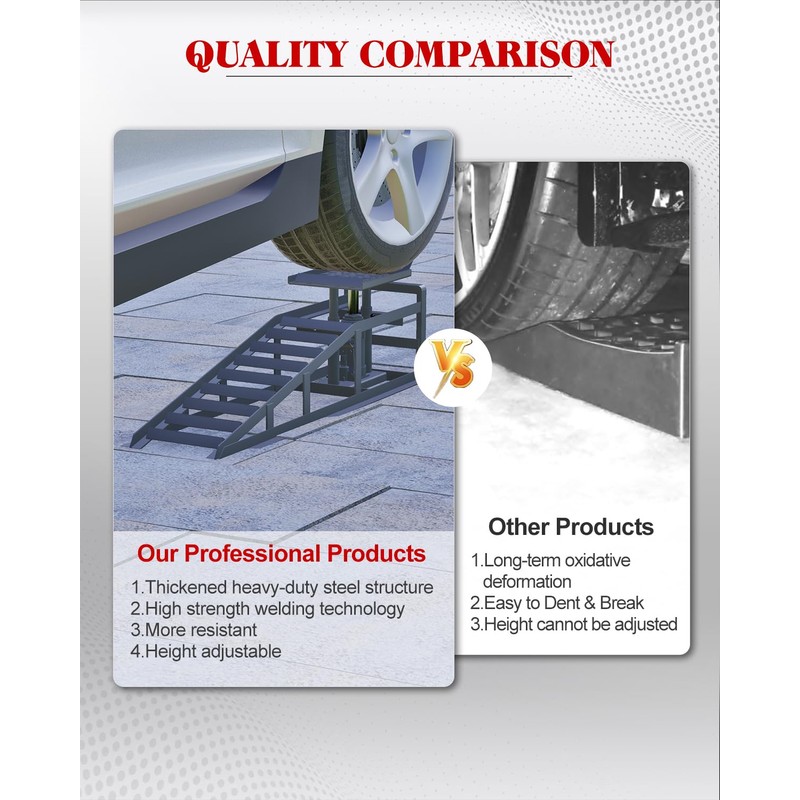 - Safer Than Traditional Ramps: Hydraulic cylinder + mechanical locking prevents sudden drops. Low-profile design fits sports cars, while wide bases keep vehicles stable during repairs.