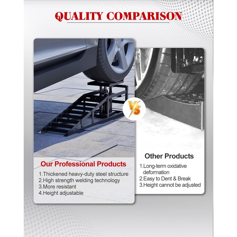 - Safer Than Traditional Ramps: Hydraulic cylinder + mechanical locking prevents sudden drops. Low-profile design fits sports cars, while wide bases keep vehicles stable during repairs.