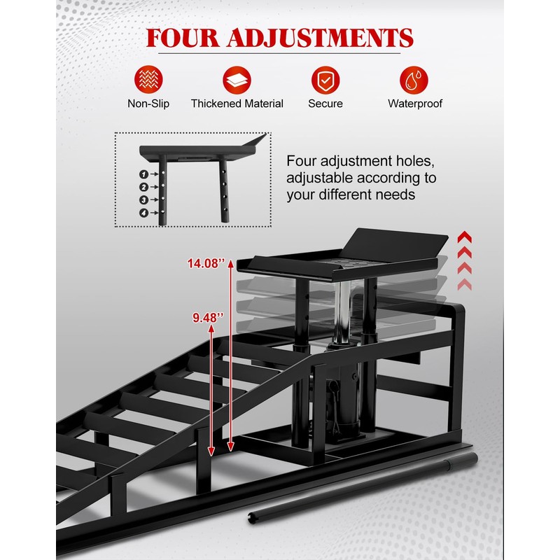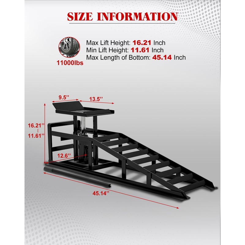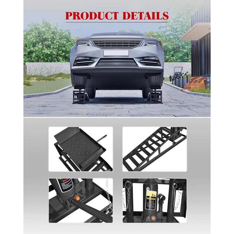 - Hydraulic Lift + Jack Combo: Includes two 5T hydraulic ramps + a hydraulic jack for effortless lifting/lowering. Adjust heights precisely (up to 16.21") for oil changes, tire rotations, or undercarriage work.