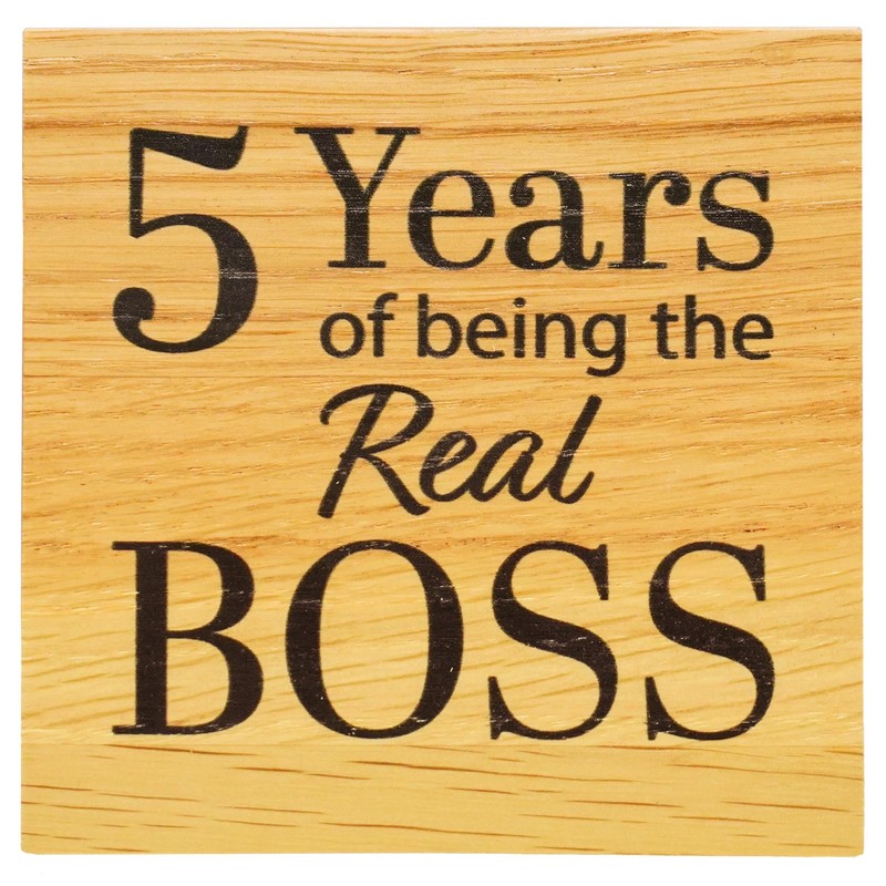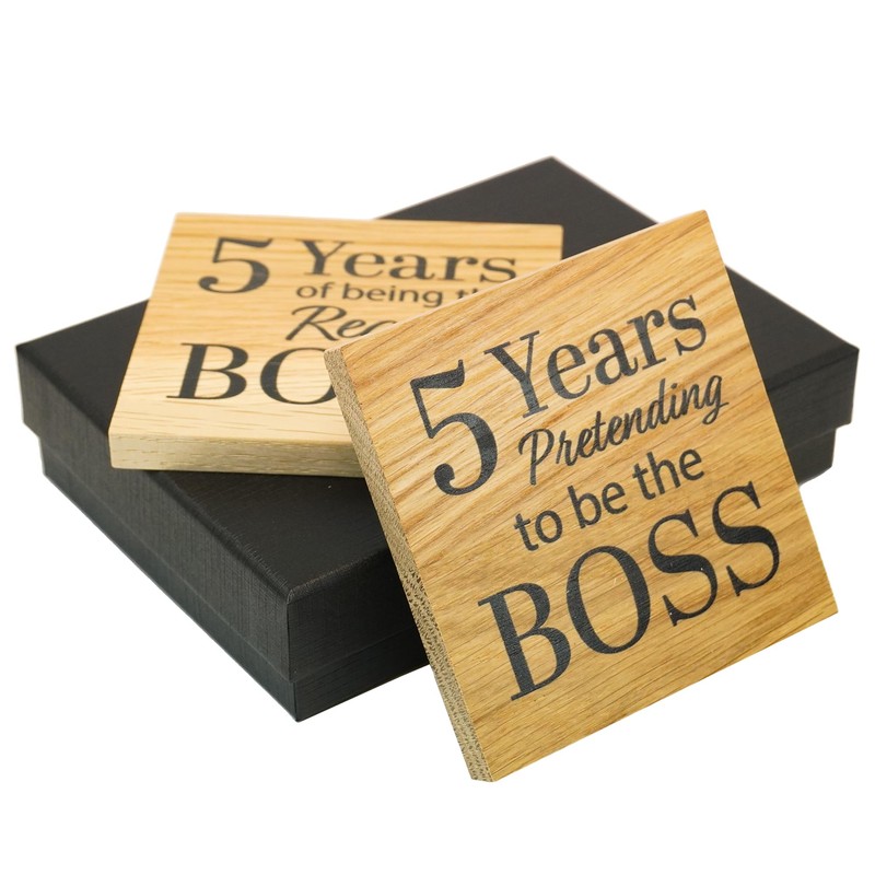 5th Anniversary Solid Oak Coaster Set in Presentation Box. Great Gift in Wood for Couple with sense of humour. Boss and Real Boss Drinks Mats in Gift Box. Ready to Give. Wooden Wedding Him and Her