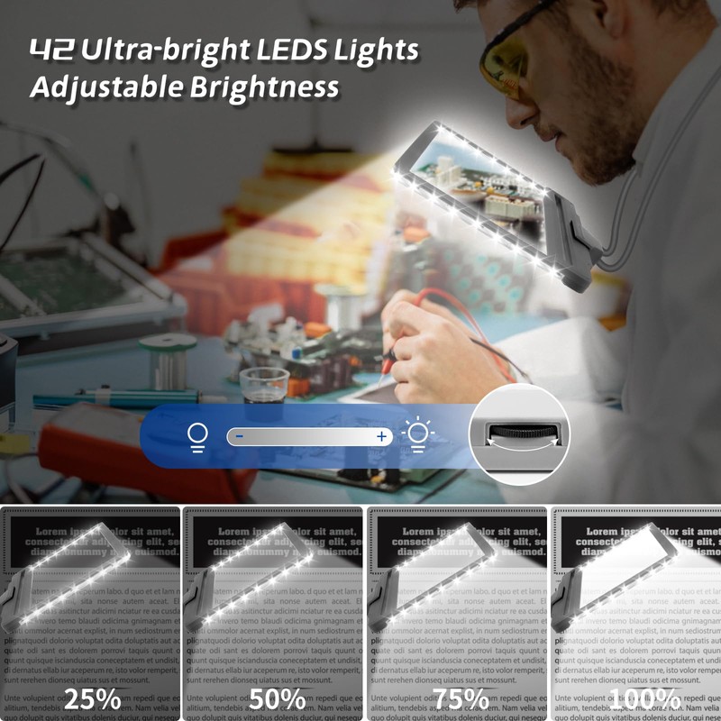 - 【42 Super Bright Energy LEDs】 This magnifier with light is great for reading, provides a bright and uniform lighting area, relieves eye fatigue with built-in 42 super bright LEDs, and is more energy efficient than traditional illuminated magnifiers. 3AAA Battery is not included.