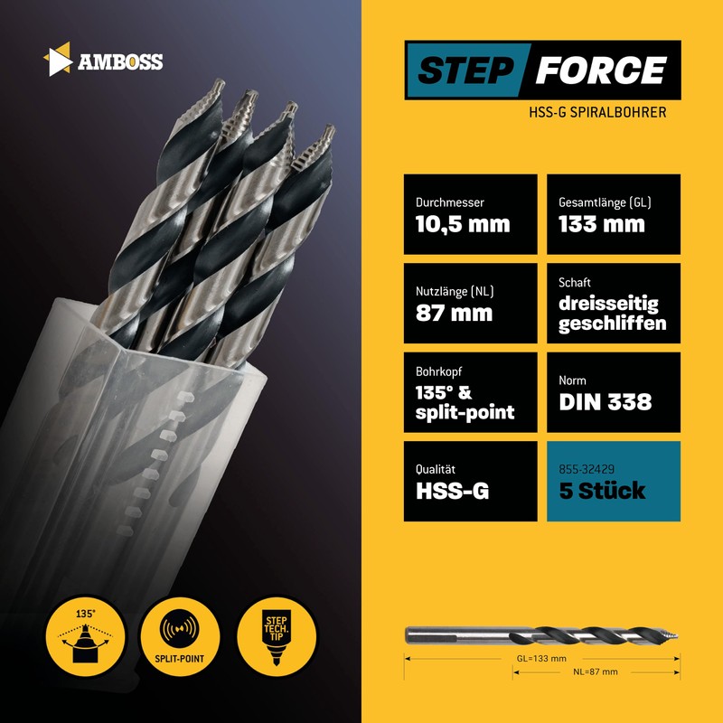- Step Force – 5 pieces twist drill bit diameter 10.5 mm / NL: 87 mm / GL: 133 mm 135° with innovative step drill geometry at the tip (from diameter 3 mm). Pre-drilling with smaller diameters and grains are no longer necessary - save time and nerves with the anvil Step Force HSS-G professional metal drills