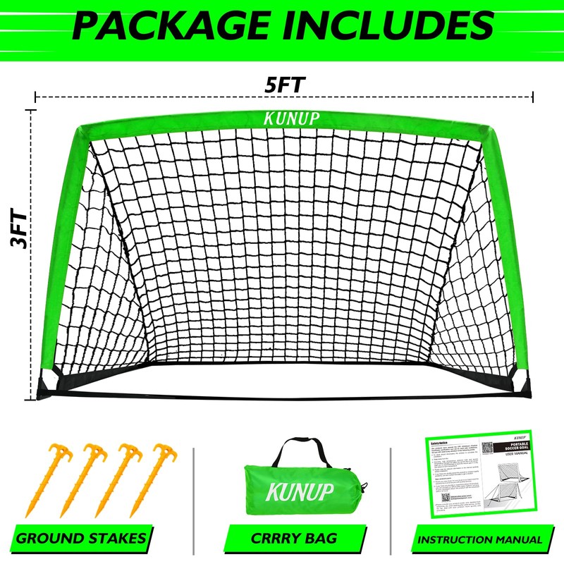 - Foldable Design for Easy Use - Set up or fold down within minutes—no complicated assembly required. Lightweight and compact, Kunup soccer goal fits easily into the included carrying bag, making it convenient to transport and store for backyard games, park practice, or family trips.