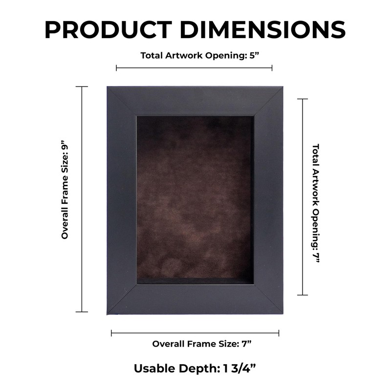Black wood shadow box frame with interior dimensions of 5x7 inches with 1 3/4 inches of usable depth. UV-resistant, frame-grade acrylic protective front. Features our 4-ply acid-free backing in brown suede. Usable depth is 1 3/4 inches. Overall frame size is 7x9 inches. Includes shatter-resistant acrylic front, acid-free backing and wall hanging hardware. Hanging hardware is included but not installed—easily attach for vertical or horizontal display! Proudly made in the USA!