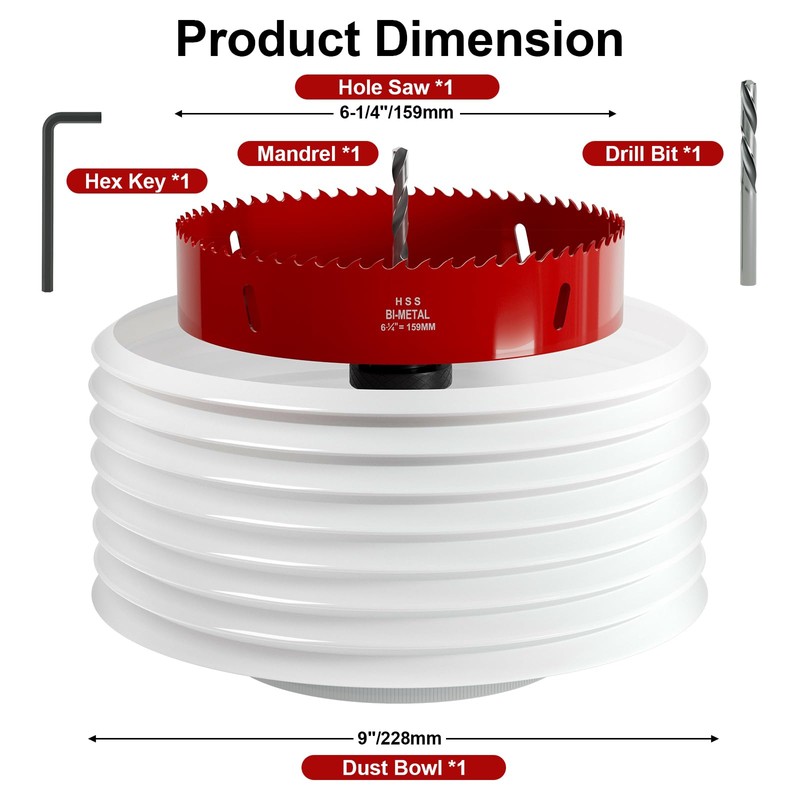 6-1/4 Inch Hole Saw with Dust Bowl for Recessed Lights - 159 mm M42 HSS Bi-Metal Hole Cutter, Hex Shank, Hole Saw Tools for Wood, Plywood, Plastic, Gypsum Board, Various Thin Metal Sheets