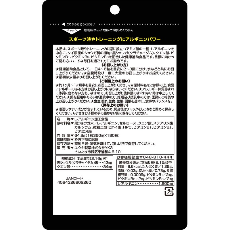 - 本品は、スポーツ時やトレーニングの際に役立つアミノ酸の一種・L-アルギニンを中心に、タイ原産のショウガ科の植物黒ショウガ(クラチャイダム)、クエン酸、ビタミンB1、ビタミンB2、ビタミンB6を配合した健康補助食品です。目標に向かって励む方、ハードな毎日を過ごす方にお勧めです。[国内製造品]