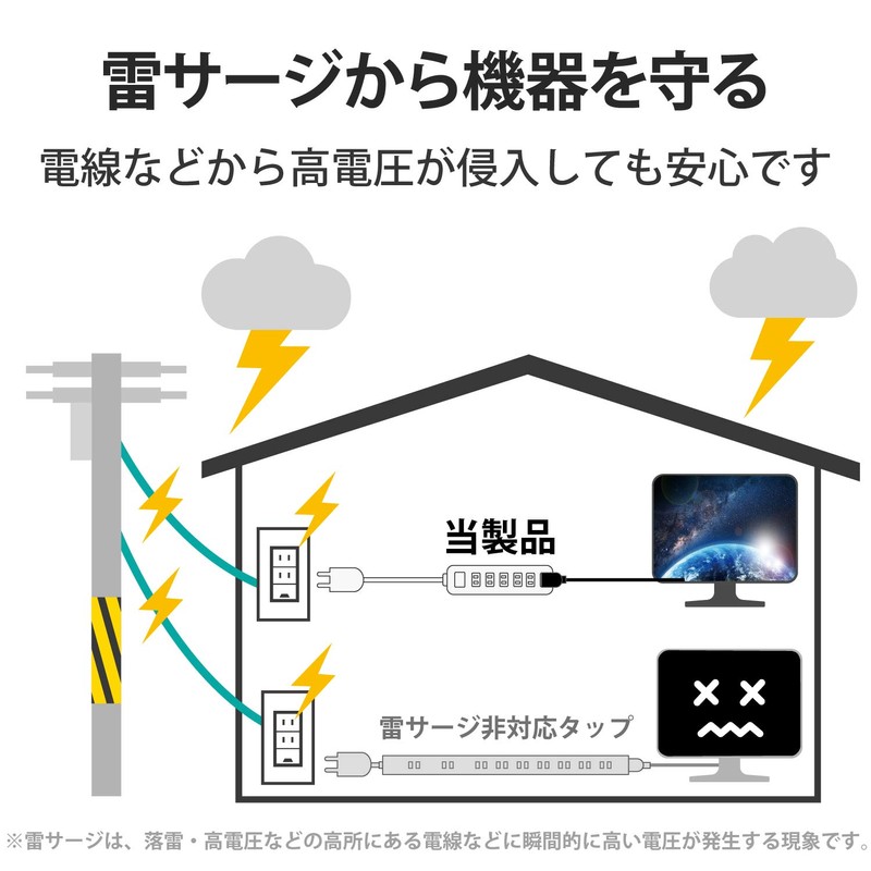 - It has a high performance lightning surge absorbing element (baristor) with a maximum surge voltage of 12,500 V, so it is effective in preventing the damage to electronic devices such as PCs and AV devices. The maximum surge voltage of 12500 V is based on the JEC210/212 standard. The maximum surge voltage is 4500V on the IEC61000-4-5 standard