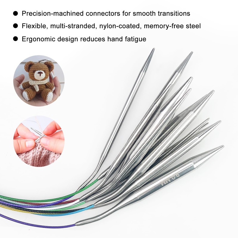 - Package Includes:1 PCS 16 inch fixed circular knitting needles,1 large eye blunt needle. Needle tips are permanently marked with US and MM markings on the needle tip eliminate the need to find the right size for specific designs.