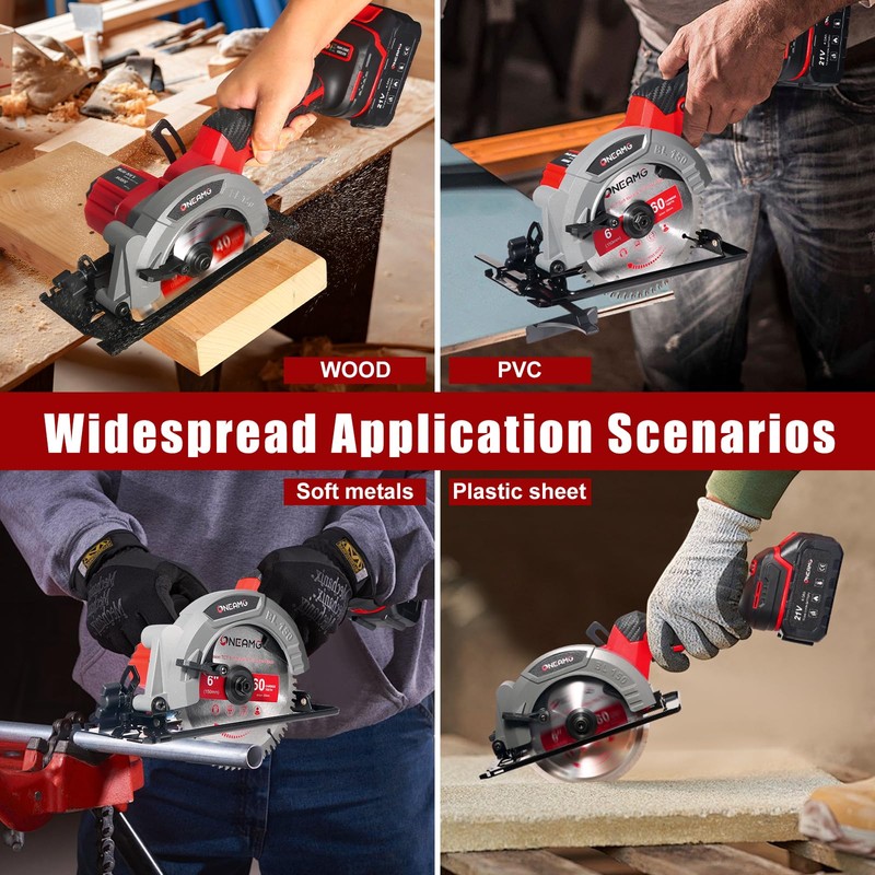 - 【Pro-Grade 6-Inch Blades & 21V 4.0Ah Battery】 Includes 2 specialized blades: 40T carbide-tipped blade for wood (fast rip cuts) and 60T trapezoid blade for aluminum/soft metals. Powered by a 21V 4.0Ah Li-ion battery (compatible with OneAmg 21V tools) and 2A fast charger – fully recharges in 1 hour.