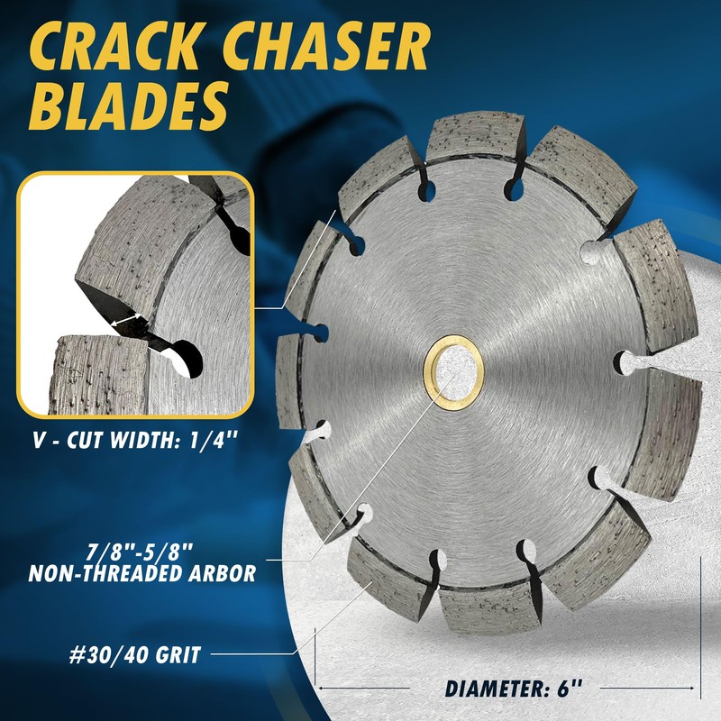 6" Crack Chaser Blade for Cured Concrete, Asphalt Repair or Joint Widen, 0.375" Width, 7/8"-5/8" Non-Threaded Arbor
