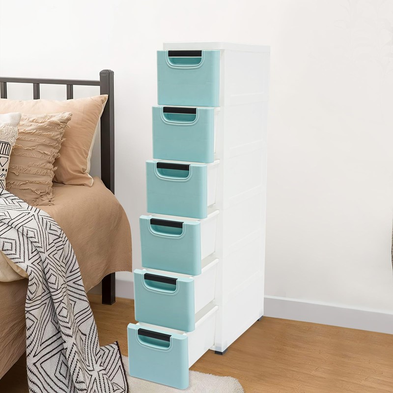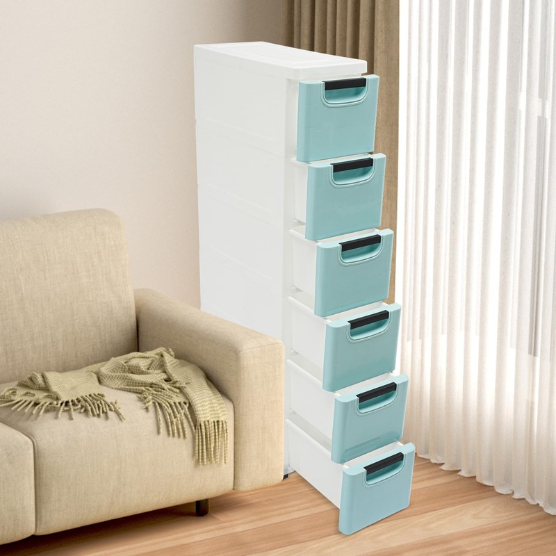 6 Drawers Storage Cabinet, Narrow Plastic Dresser, Rolling Organizer Cart, Mobile Slim Utility Cart on Wheels, Storage Drawer for Small Spaces (Blue)