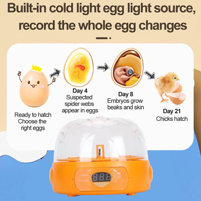 1、Main Use: Mainly used for seed egg incubation, embryo development, poultry hatching, etc. The machine is compact and fully functional. 2、Educational Function: It is very suitable for ordinary families to use for parent child science education and enlightenment, so that more people can witness the birth of life in close proximity. 3、Dual Power Supply: Stable control, more concise, and dual circuit protecting (power supply and battery dual use), even if the power outage products can still operate normally, all weather guarding the safety of the eggs. 4、Automatic Egg Turning: Low noise fan is used, which does not affect daily life. Comes with an egg turning function to ensure even heating and free your hands, can hold 6 breeding eggs at a time. 5、Compact and Convenient: It be used for hatching all kinds of chicken, duck, goose, pigeon eggs and other poultry, compact and lightweight design. (Incubator need to set the appropriate temperature according to the type of egg, need to manually add water)