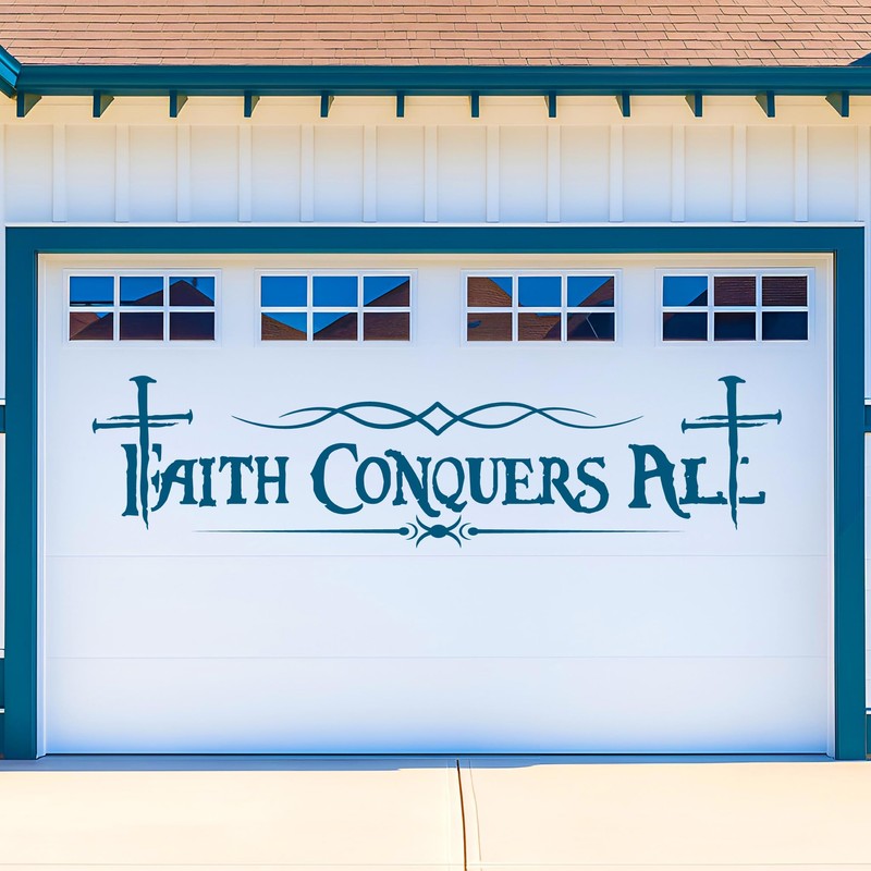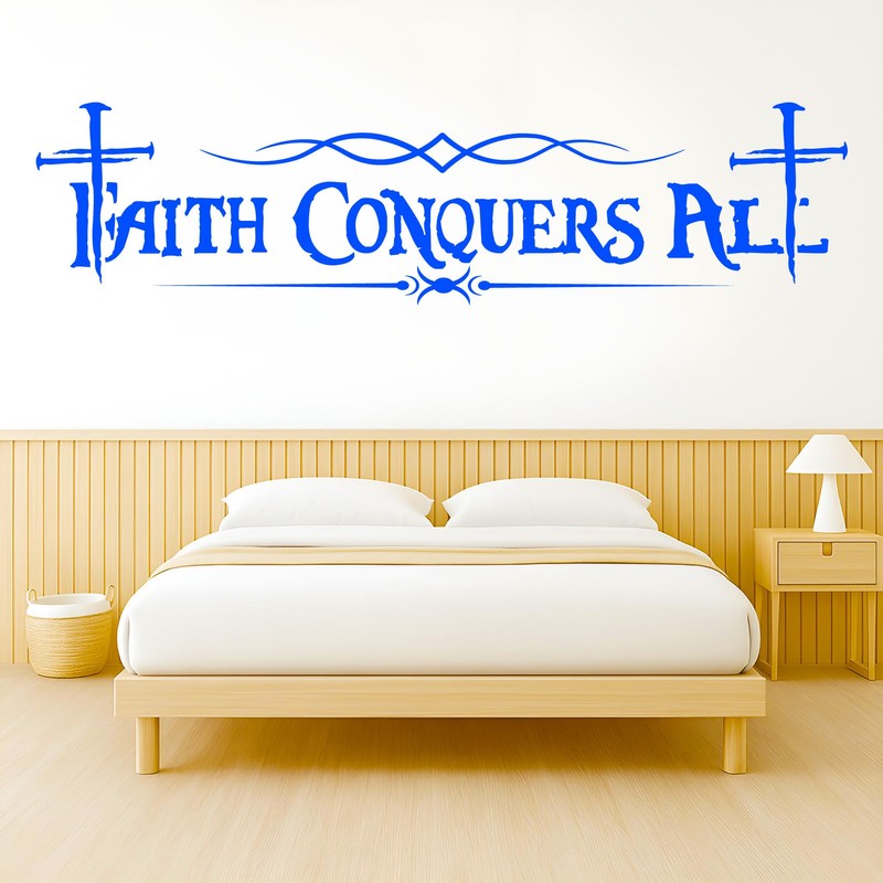Show your devotion and inspire daily strength with the giant 6ft “Faith Conquers All” wall decal, designed with bold Christian lettering and an uplifting biblical message. Perfect for homes, churches, offices, storefronts, and prayer rooms, this oversized vinyl sticker brings powerful scripture-inspired motivation to any wall, garage door, or window. Whether placed in a living room, bedroom, business, or sanctuary, it’s a striking piece of Christian décor that reminds everyone of God’s love and guidance. Crafted from premium adhesive vinyl, this oversized mural is built for both indoor and outdoor use. The simple peel-and-stick application makes it easy to install on walls, glass, mirrors, or other smooth surfaces. At 6 feet tall, this jumbo faith decal creates an eye-catching display that stands out in churches, man caves, farmhouse homes, or storefronts while holding strong and removing clean. This decal makes a meaningful faith-based gift for pastors, church members, Catholic families, and anyone who wants to display their Christian values proudly. Great for birthdays, holidays, and spiritual milestones, it’s a thoughtful way to celebrate prayer, scripture, and the message of Jesus Christ. Proudly Made in the USA, this durable vinyl faith decal is weather-resistant and long-lasting. A perfect addition to Christian art collections, it’s more than decoration—it’s a spiritual statement of hope, strength, and belief that truly says, Faith Conquers All.