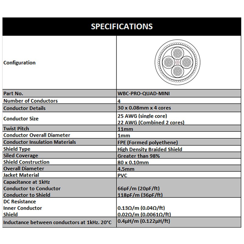 - WBC-PRO-QUAD-MINI is truly the Most-Silent & the Most-Flexible Mini-Star-Quad cable in the market & boasts a flexible outer jacket, a dense braided shield (above 98% coverage) & four, 0.08mm Fine-Stranded 99.99% Oxygen Free Copper cores (25AWG per core & 22AWG in use). Excellent shielding coupled with the Star Quad design totally cancels out all EMI & RFI, this stage-ready cable will encounter, resulting in the purest form of signal transmission. Superior to Industry leaders like Mogami 2893.
