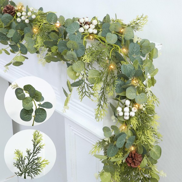 - 6 Ft Cedar Eucalyptus Garland: The package includes a 6 Ft artificial Christmas garland along with a string of LEDs lights. The warm white lights and dense cypress and eucalyptus branches will add a cozy holiday atmospheres