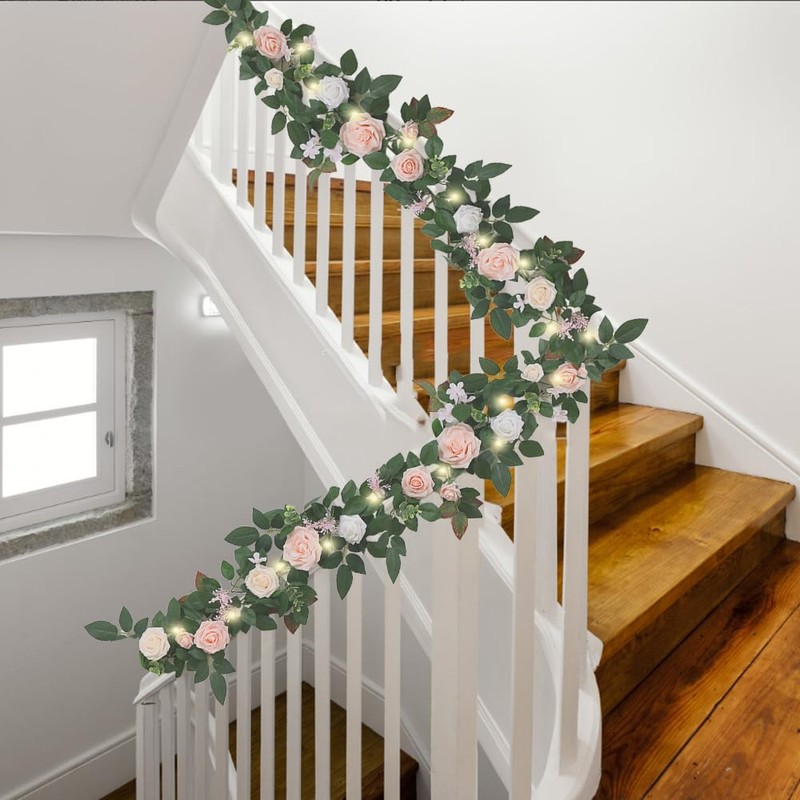 - SIZE AND MATERIAL: This handmade rose garland is 6ft long, made of high quality foam roses and artificial greenery, making the vines look very realistic, easily add a touch of color and romance to your home. Set includes a 9.8ft long string of lights (string of lights does not include batteries, you need to prepare 2 AA batteries by yourself)