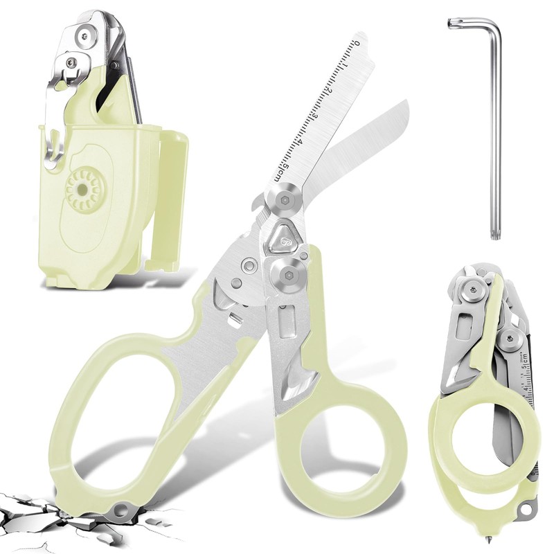 6 In 1 Emergency Shears, Stainless Steel Foldable Trauma Shears with Strap Cutter and Glass Breaker, Outdoor Camping Tools (Luminous-Silver)