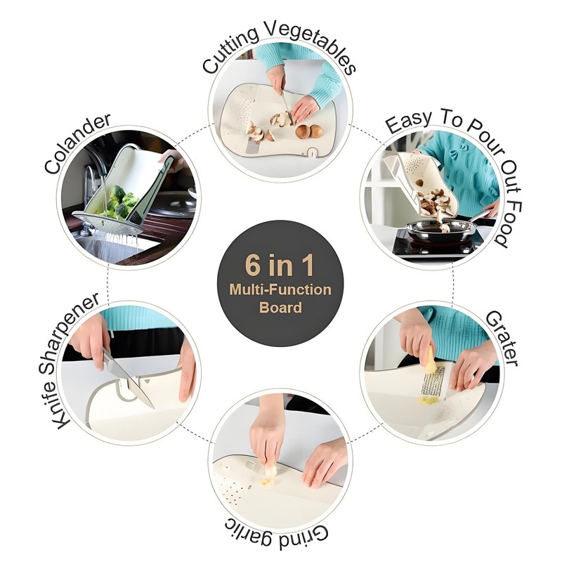 - VERSATILE 6 IN 1 FUNCTIONALITY This innovative cutting board combines six key features for outdoor kitchen: washing, cutting, draining, grating, garlic and ginger crushing, and sharpening knives. It offers a space-saving and practical solution for camping and outdoor activities, so you can do all your important tasks with just one product.