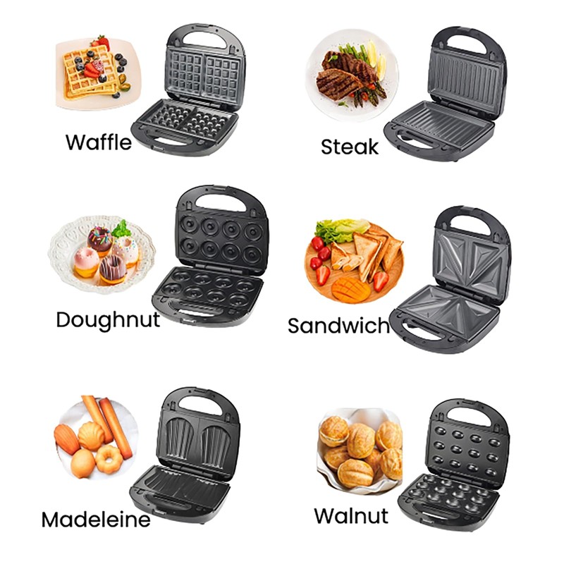 Versatility: Equipped with six interchangeable non-stick plates, including waffle, ribbed, doughnut, sandwich, Madeleine, and nut plates, catering to a variety of culinary needs