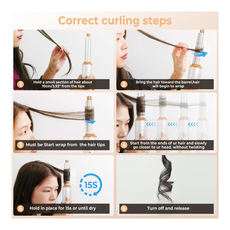 - 【Tips for Using A Brush Hair Dryer】 1.Hold a small section of hair about 10cm/3.93" from the tips. 2.Bring the hair toward the barrel,hair will begin to wrap. 3.Must be Start wrap from the hair tips. 4.Create tension and bring towards your head. 5.Hold in place for 15s or until dry. 6. Turn off and release. The usage of hot air curling sticks is different from the regular curling sticks. If you are confused during use, please contact us and we will provide you with professional service support.