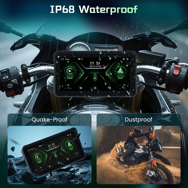 - Built Tough for the Road:Engineered with IP68 waterproof, dustproof, and shockproof protection, this 6-inch screen withstands heavy rain, off-road dust, and vibrations. The auto-dimming HD display stays clear in sunlight or night rides.