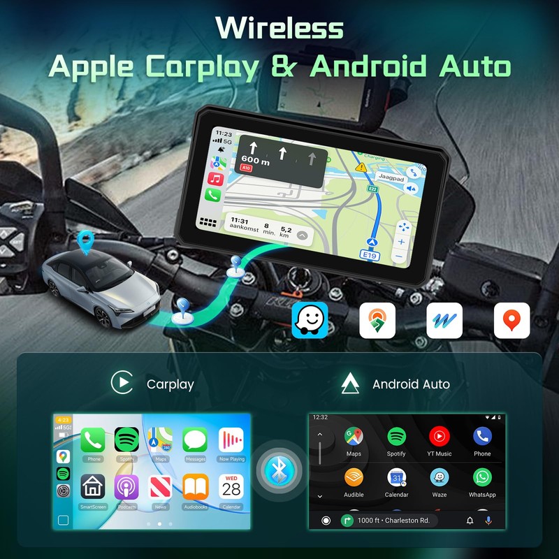 - Seamless Wireless Connectivity:Enjoy instant access to Wireless CarPlay & Android Auto for hands-free navigation, calls, and music. Mirror Link effortlessly displays your phone screen, while voice control lets you command maps and playlists without touching the screen—perfect for safe riding.