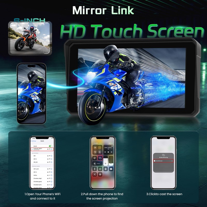 6-inch Motorcycle CarPlay Screen - Wireless CarPlay/Android Auto, IP68 Waterproof & Shockproof Touchscreen, Dual Bluetooth for Helmets, Adjustable Mount, Mirror Link, GPS Navigation, Voice Control