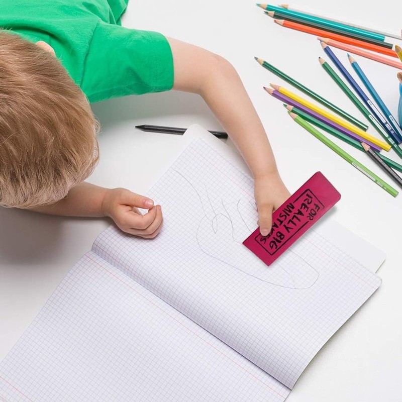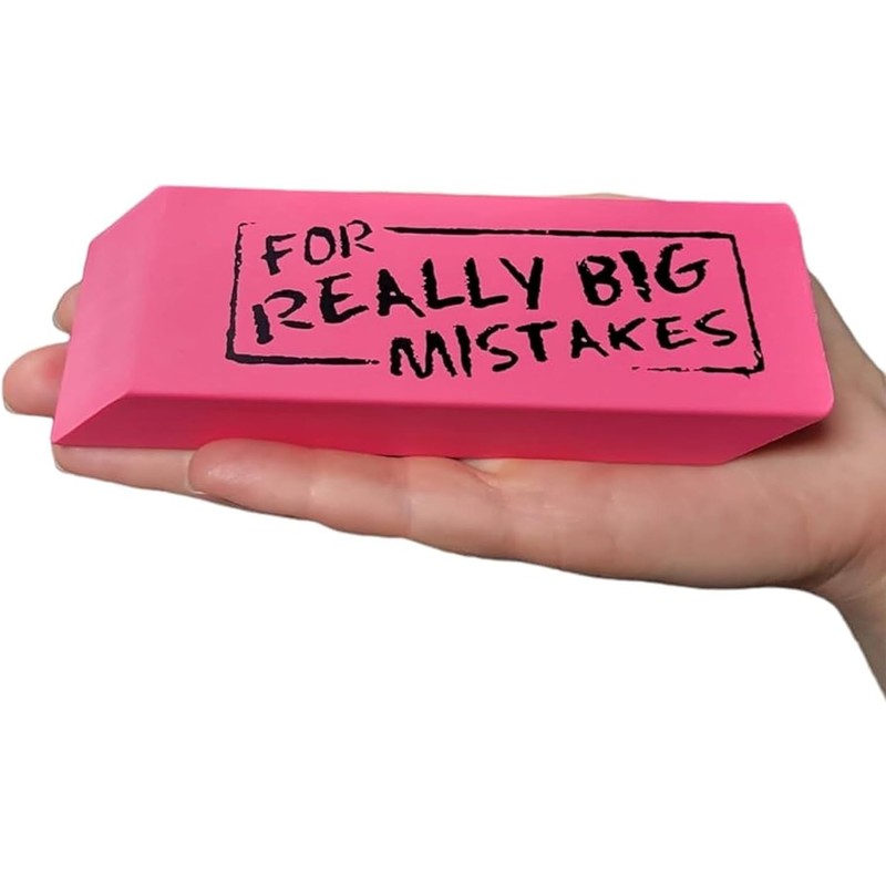 Here's a humongous version of the always popular pink eraser. Ours is 3/4 of a pound and 6" long x 2" wide x 1" thick. The top says "For Really Big Mistakes" but that, not surprisingly, rubs right off if you don't like it there.
