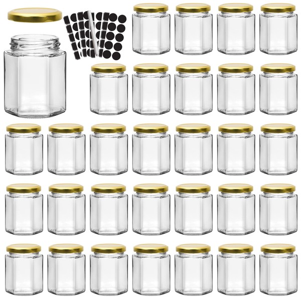 - High quality and premium glass jars set, contains 30 pack of 6 ounce hexagon jars with gold metal lids, made of durable, visable and clear glass material.The transparent glass is easy for you to distinguish the things you put in jars.