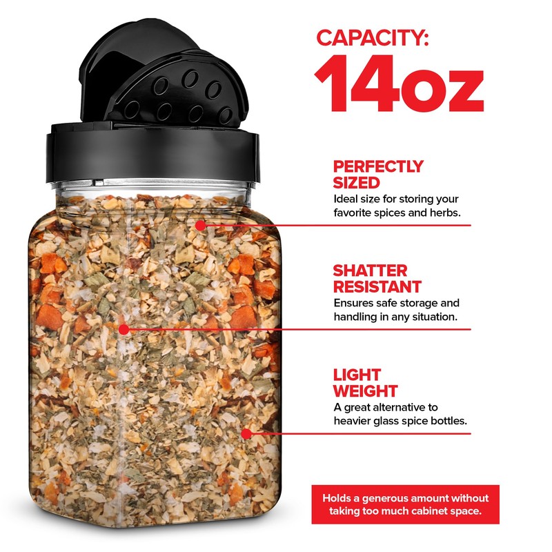 - Perfectly Sized: At 14 ounces, our clear plastic spice jars with shaker lids are the ideal size for storing your favorite spices and herbs. They're large enough to hold a generous amount, but not so bulky that they take up valuable cabinet space.