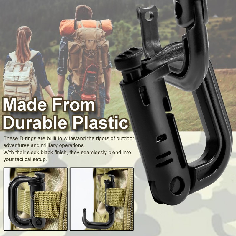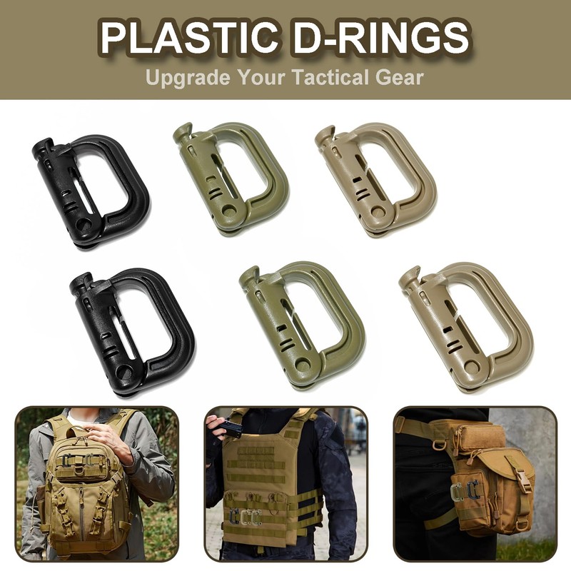 Upgrade your tactical gear with this 6-pack of heavy-duty plastic D-rings. These carabiners are the perfect addition to any molle system backpack, tactical vest, or gear pouch. Featuring a snap locking hook design, they provide a secure and convenient way to attach webbing straps, hang accessories, or organize your equipment. Made from durable plastic, these D-rings are built to withstand the rigors of outdoor adventures and military operations. With their sleek black, armygreen, lightKhaki finish, they seamlessly blend into your tactical setup. Whether you're a seasoned outdoorsman, a member of law enforcement, or a military professional, these D-rings will become an indispensable part of your loadout. Maximize the functionality of your molle system and keep your essentials within easy reach.