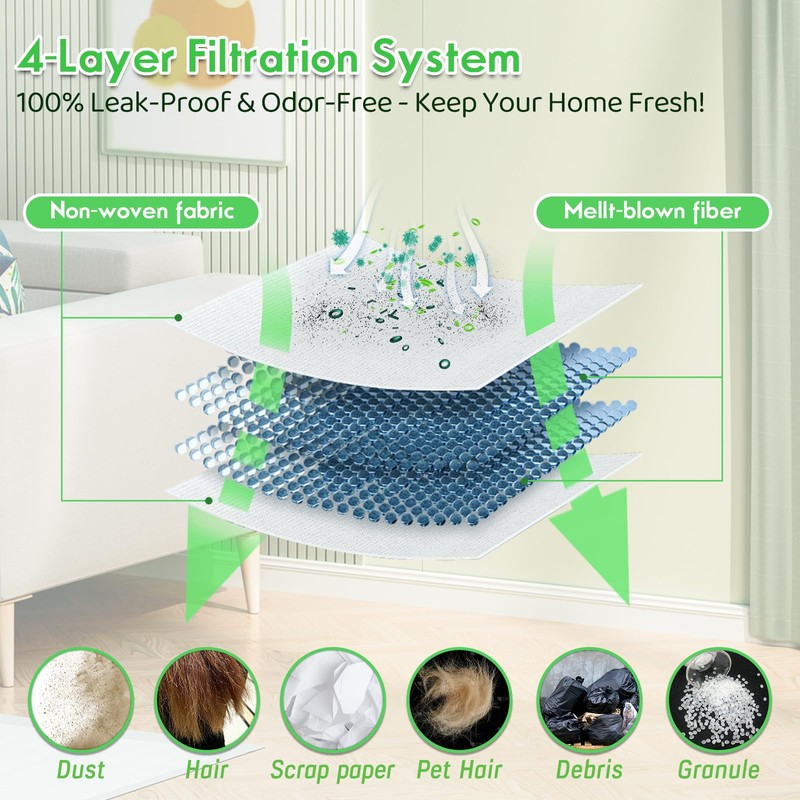 • Advanced 4-Layer Filtration System: Captures 99.9% of particles, including fine dust, allergens, pet hair, and debris as small as 0.3 microns—perfect for allergy relief and a cleaner environment