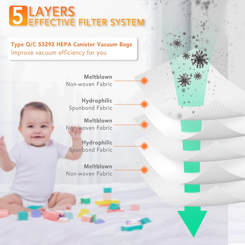 - Package Includes: 6 pack Type Q/C Vacuum Bags. The replacement 53292 type Q/C dust bags have 5-layer non-woven material filtration. These are cloth (not paper) HEPA-level vacuum cleaner bags replacement for Kenmore vacuum cleaners.