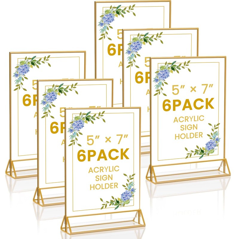 ✔PACKAGE INCLUDE: Pack of 6 acrylic sign holders with gold border. Measures 5x7 inches.