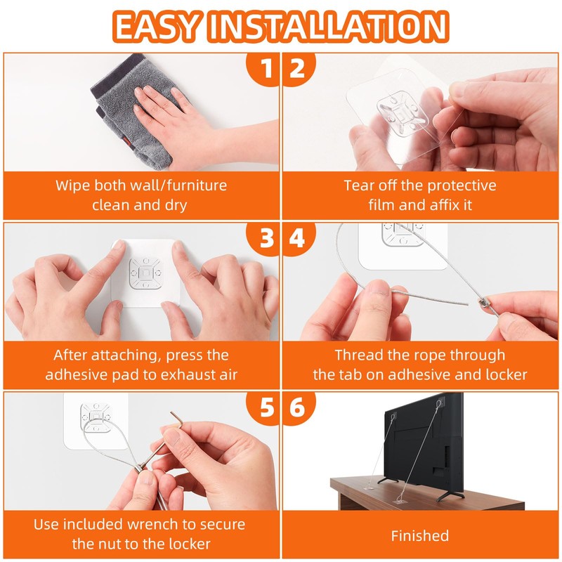 6 Pack Adjustable 42" Metal TV Safety Straps, Vinkqiado No-Drill Adhesive Anti-Tip Furniture Wall Anchors for Baby Proofing, Secure Flat Screens to Wall, Cabinet, Stand Or Desk, Dresser, Bookshelf