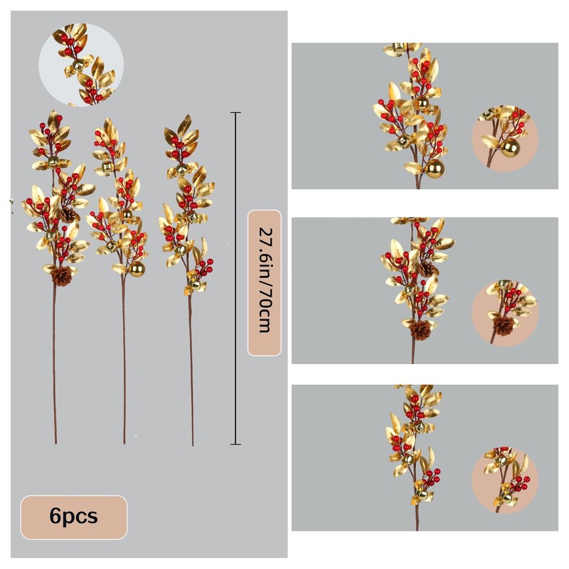 6 Pack Christmas Festive Long Picks with Artificial Golden Leaves, Red Berries, Golden Bells, and Real Pine Cone Accents for Holiday Decoration, 3 Designs (Gold)