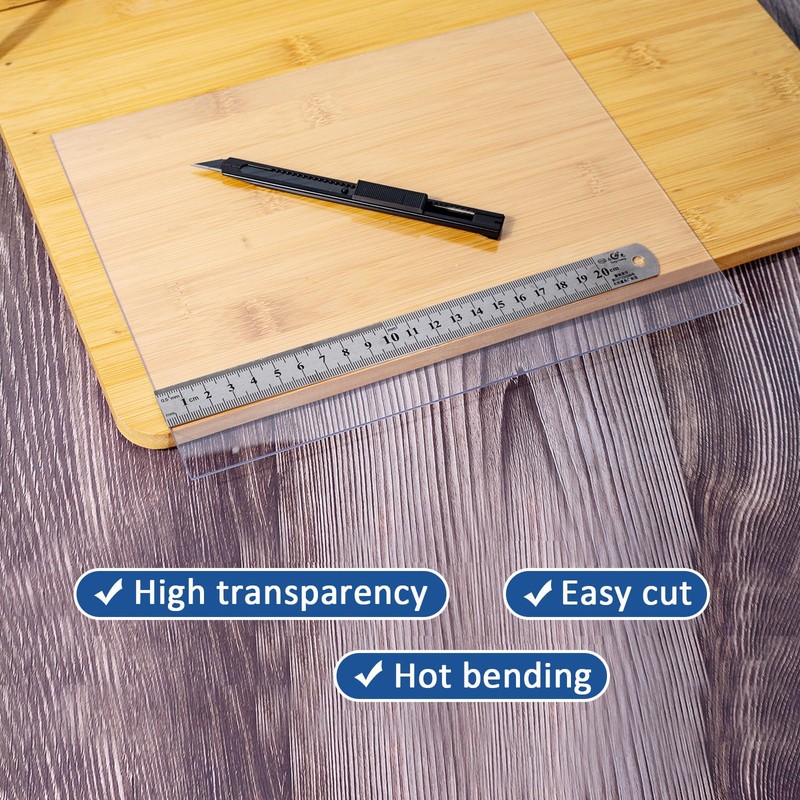 - Cutting: The 0.04In thickness of our Clear Plexiglass Sheets provides an ideal balance between flexibility and strength while cutting through them with precision tools such as Laser engraving, scissors trimming or scoring knives is a breeze due to their impressive machinability properties. There are protective films on both sides of the Clear plastic sheet to ensure that the plexiglass panel will not be scratched