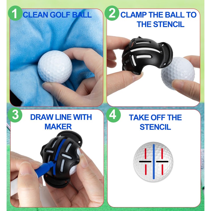 - EASY TO USE: These golf ball line markers are very simple to use, the golf ball stencil can cover the golf ball in the middle and stays in place to draw lines easily. Just perfect putting every time with fast-drying and fade-resistant markings drawn on the ball which will not be wiped off by water! 3 eye-catching colors can make you immediately identify & quickly tag your golf balls
